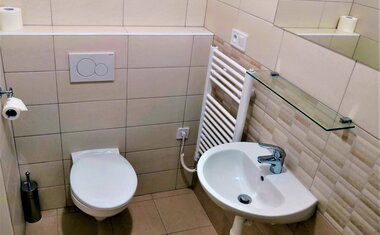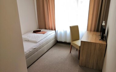 We offer six single rooms with private bathroom and toilet (one of them has a barrier-free bathroom) and seven single rooms with shared bathroom (two rooms are always connected by bathroom and toilet). There are kitchenettes in the corridors with a kettle and microwave oven. Smoking is not allowed in the rooms. Wi-fi is free for guests.